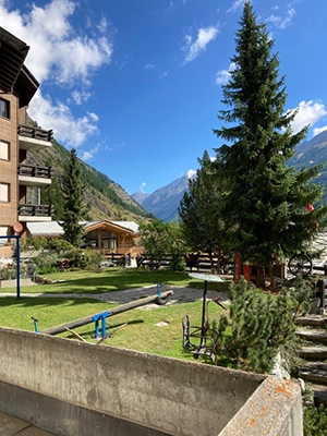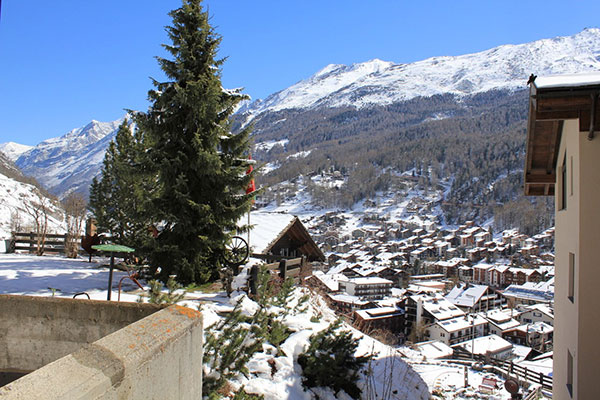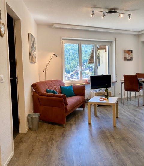 Modern eingerichtetes, helles Studio mit Sicht auf das Dorf Zermatt und die umliegende, fantastische Bergwelt. Das Haus Bodmen B ist an ruhiger Hanglage zentral gelegen, nur 5 Gehminuten zum Herzen von Zermatt sowie zum Bahnhof und zum Ski-Bus.