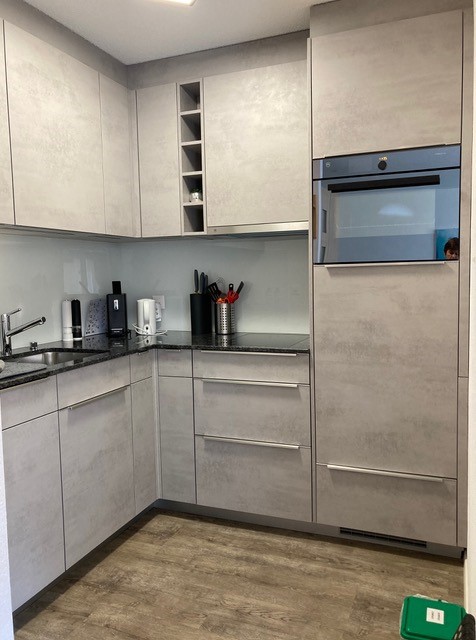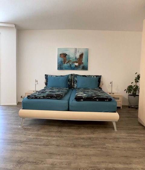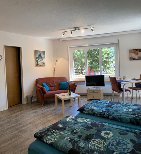 Nichtraucher Studio 35 m2 mit Parkettboden, Balkon süd/ost. Tisch & 2 Stühle. Offene Küche, gemütlicher Wohn-Schlafraum mit Esstisch,